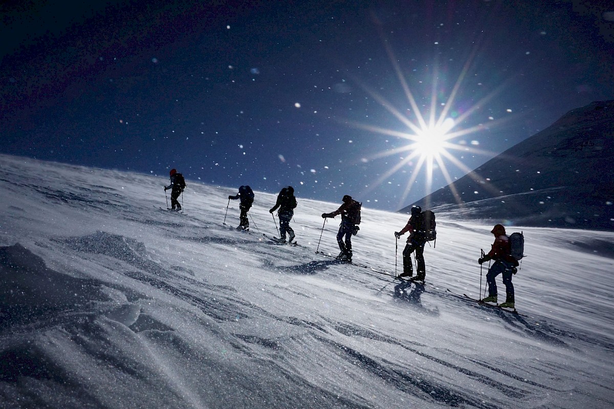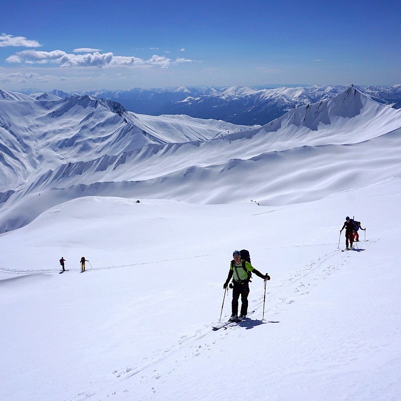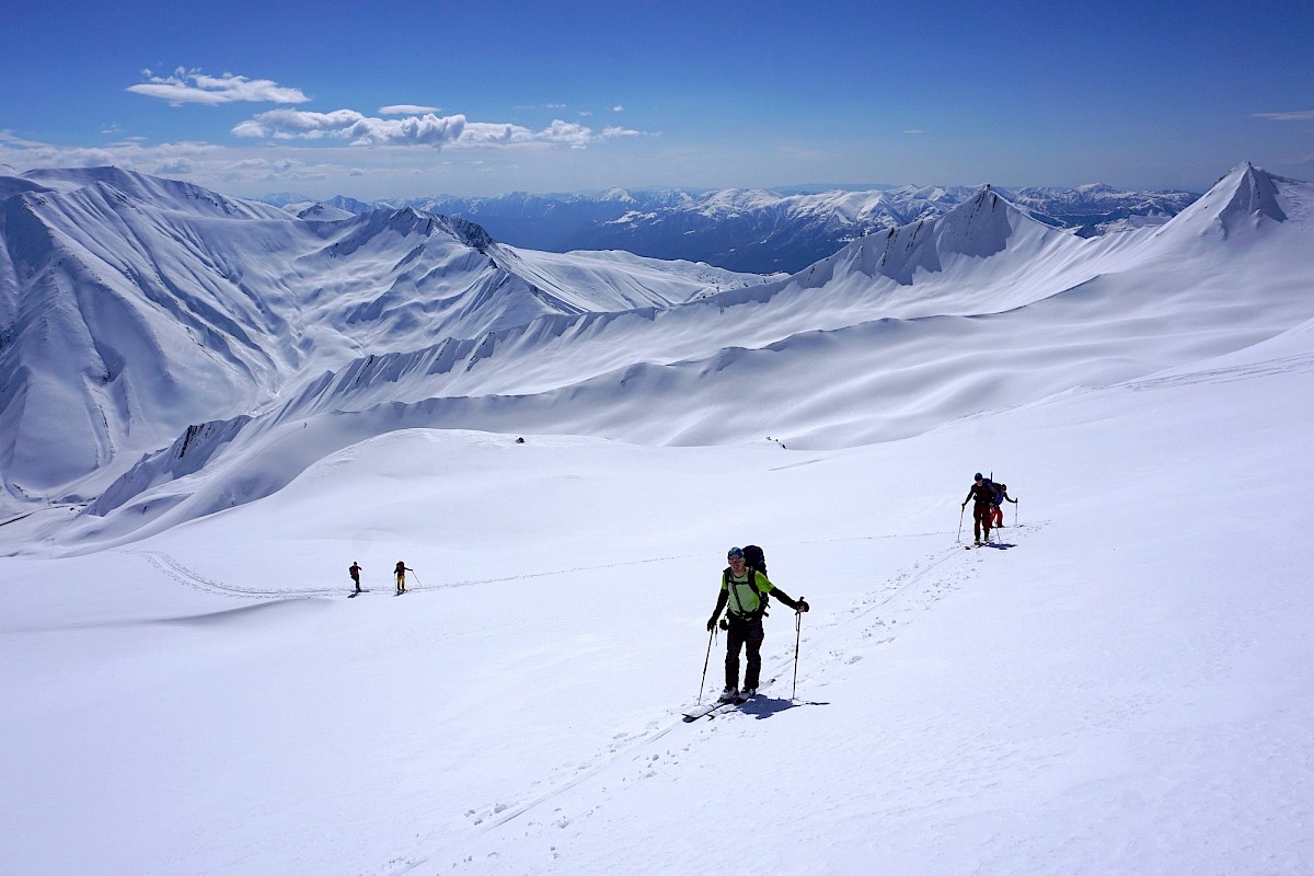 Die heutige Skitour bringt uns erstmals in vergletschertes Gelände. Entlang des Gergeti Gletschers steigen wir an der Bethlemi Hütte vorbei zum Ortsveri (4.365m) auf. Eine lange Abfahrt über schönes Skigelände bringt uns zurück zur Alti Hut.