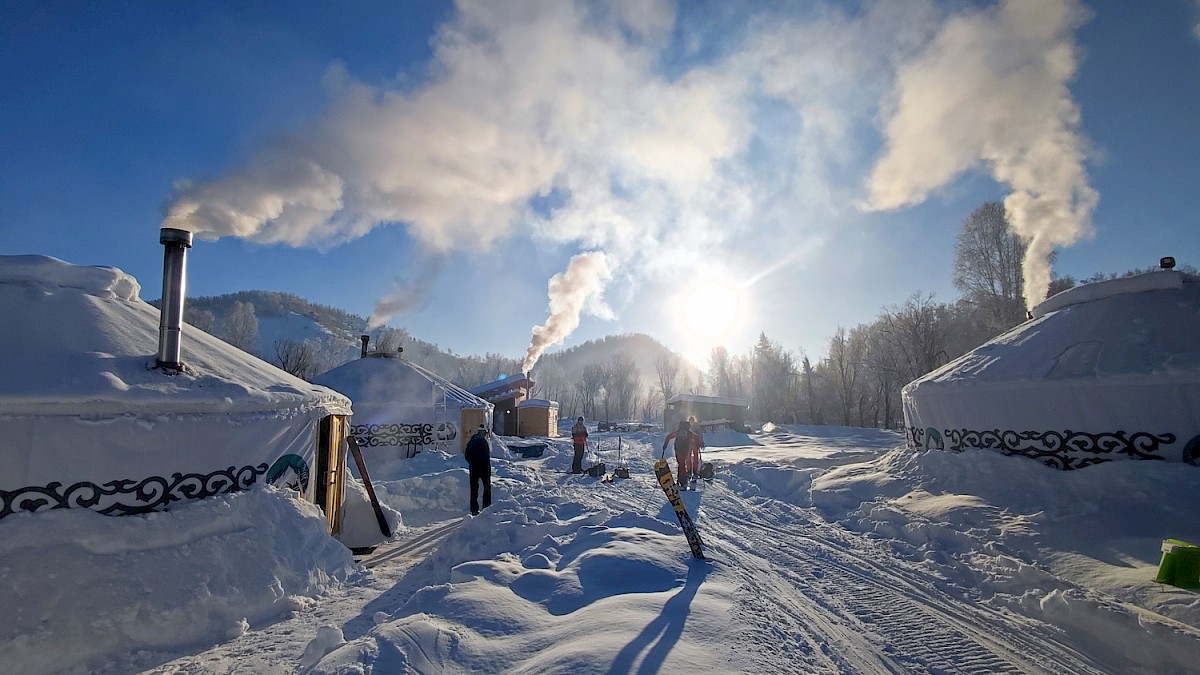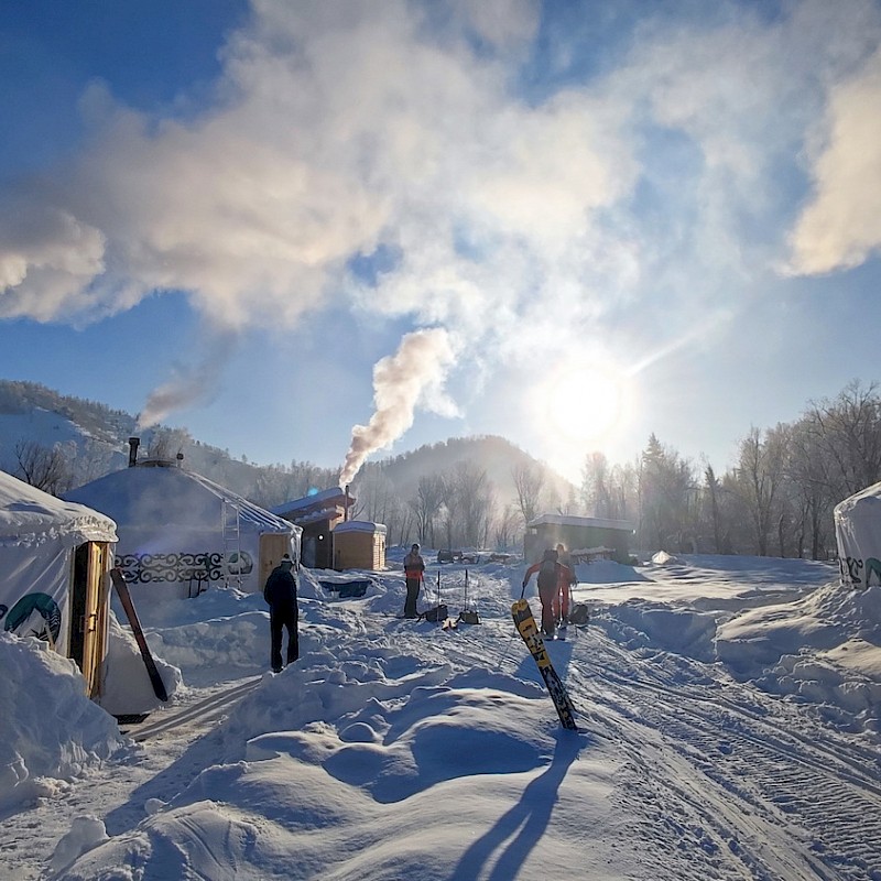 Unsere Unterkunft, die Altay Mountain Lodge ist 15 Minuten mit dem Skidoo vom nächsten Ort entfernt. Das moderne Jurten Camp ist ein perfekter Ausgangspunkt für eine Vielzahl an Skitouren und versprüht mit den gemütlich eingerichteten Jurten richtig Wohlfühlcharakter. Innen ist es angenehm warm, während draußen je nach Tageszeit zwischen -5°C und -20°C vorherrschen. Die Zimmer und Bäder, sowie der allgemeine Bereich mit Restaurant sind gut geheizt und wer es noch wärmer mag, der kann sich nach der Skitour täglich im hölzernen Banya (ähnlich einer Sauna) richtig entspannen. Die Schlafjurten sind im Inneren zusätzlich in Zweierzimmer abgeteilt. Rund um die Uhr werden wir mit kasachischen Köstlichkeiten verwöhnt, ob beim Frühstück, mit einer warmen Suppe direkt nach der Skitour oder beim gemeinsamen Abendessen.